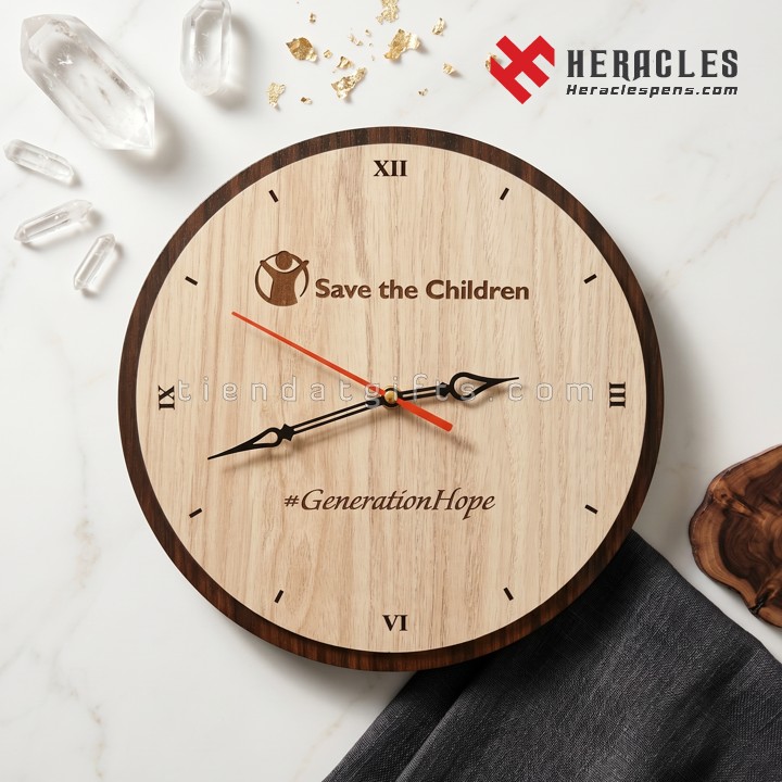 Trong dự án kỷ niệm thành lập của Save The Children, mẫu đồng hồ gỗ treo tường tròn được lựa chọn nhờ thiết kế tinh giản, dễ sử dụng và đặc biệt phù hợp để khắc logo, hình ảnh mang ý nghĩa biểu tượng.