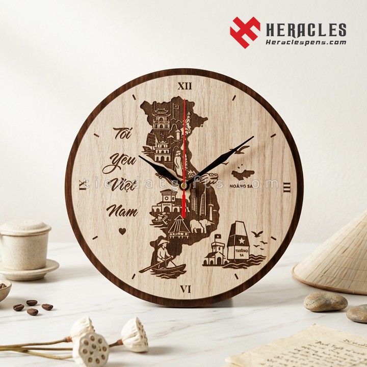 Đồng hồ gỗ trang trí cao cấp: Phối màu tự nhiên, độ bền cao, in bản đồ Việt Nam rõ nét.